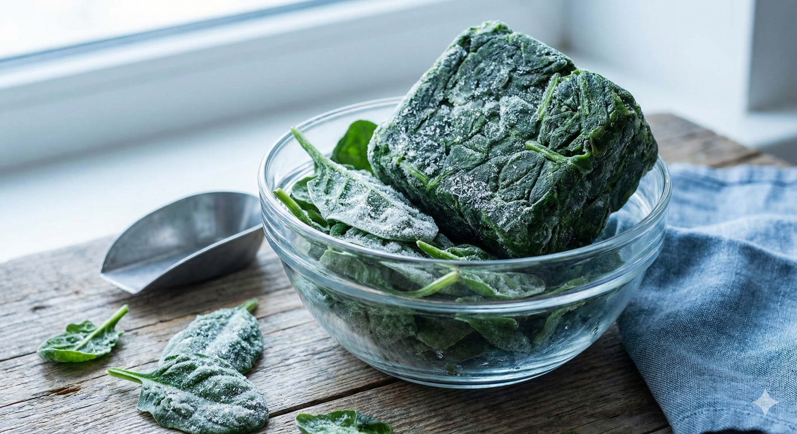 Chopped or block frozen spinach retaining natural green colour.